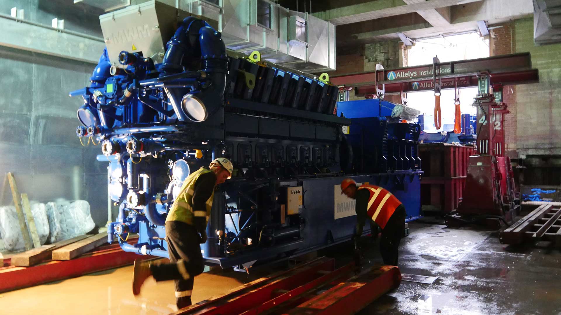 Due to the restricted ground loadings, each 53 tonne engine was delivered in three parts (bedframe, engine and alternator) and reassembled in the basement.