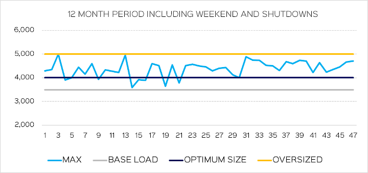 From a commercial perspective, however, the optimum engine size would provide slightly more than the base load. It would be sized to run at a full load for as long as possible, maximising the economic benefits of self-generation and resulting in only minor energy wastage.